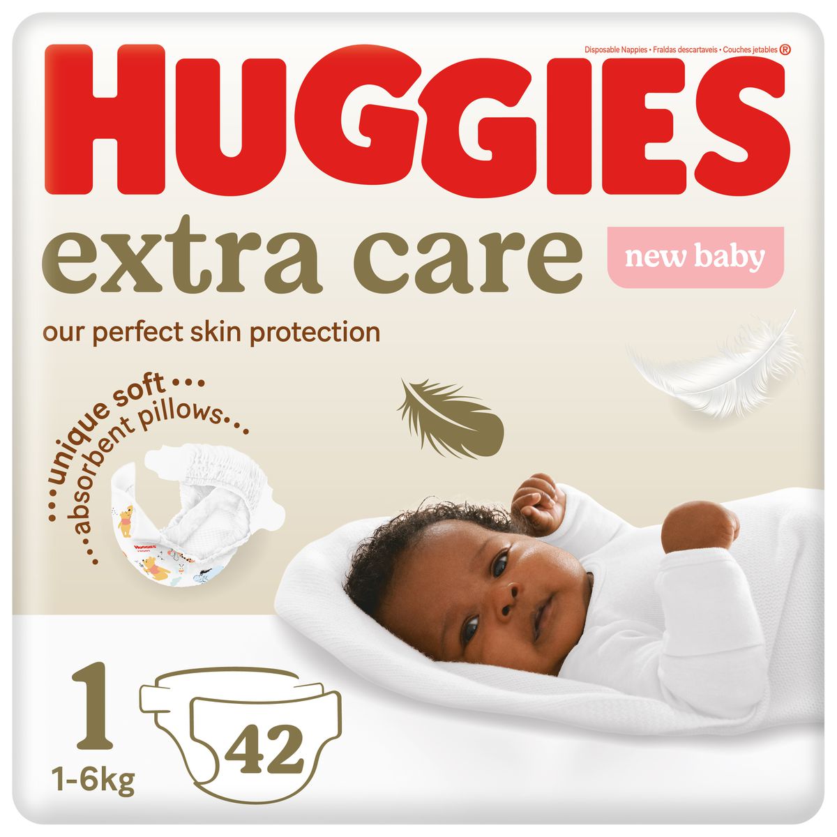 Introducing Huggies Extra Care, now available in size 1 with 42 diapers in each pack. These diapers offer ultimate protection and comfort for your little one, with advanced leak-lock technology and a soft, gentle touch. Keep your baby dry and comfortable all day with Huggies Extra Care.